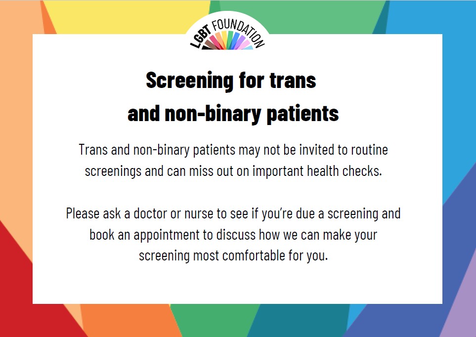Breast cancer screening, cervical smear screening, abdominal aortic screening and bowel cancer invitations are gender specific, so if you are transgender you may not be invited to the correct screening unless you let us know.
